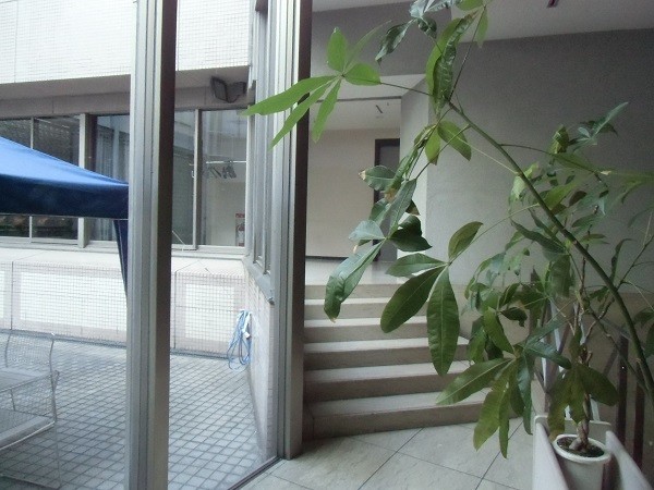 階段をあがると喫煙所にもなっている中庭が正面ガラス越し